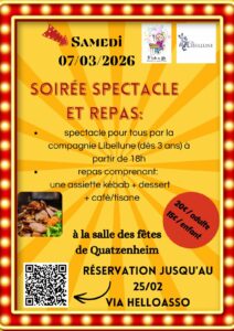 Soirée spectacle et repas – 7 mars 2026 – Organisée par l’APE L’ECOLE EN FÊTE